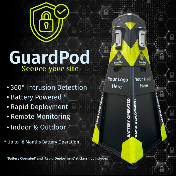 GuardPod battery powered alarm tower with built in SIM communication provides intruder alarm detection and monitoring for remote locations where traditional power and network infrastructure is not available on site.